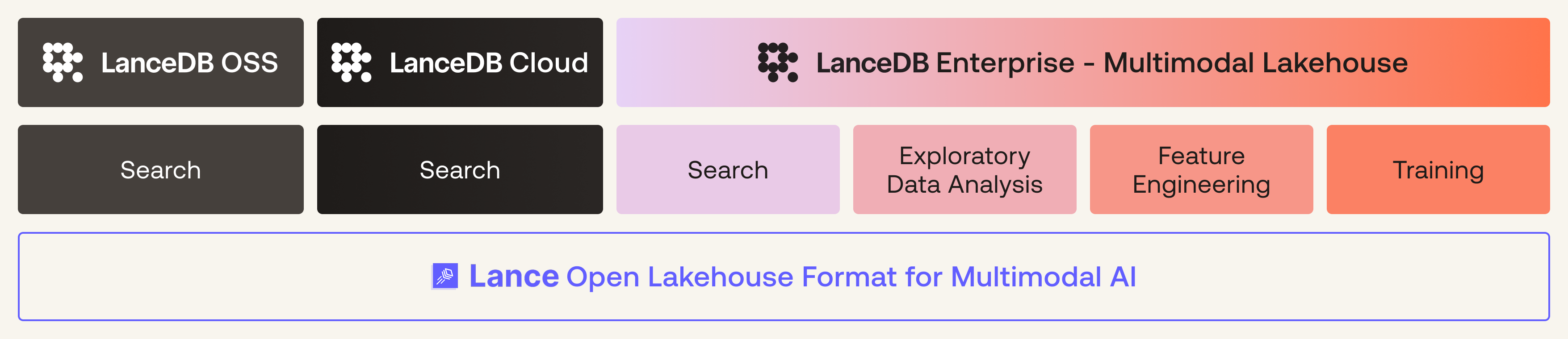 LanceDB’s multimodal lakehouse is built on top of the open source Lance format, designed to address the challenges of managing multimodal complexity we just walked through. In LanceDB, the same table can function as a lakehouse table when you’re scanning and transforming data, and like a low-latency retrieval system when you’re serving search and agentic applications.